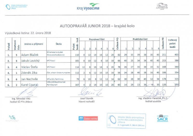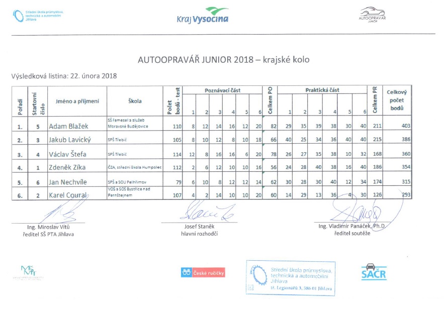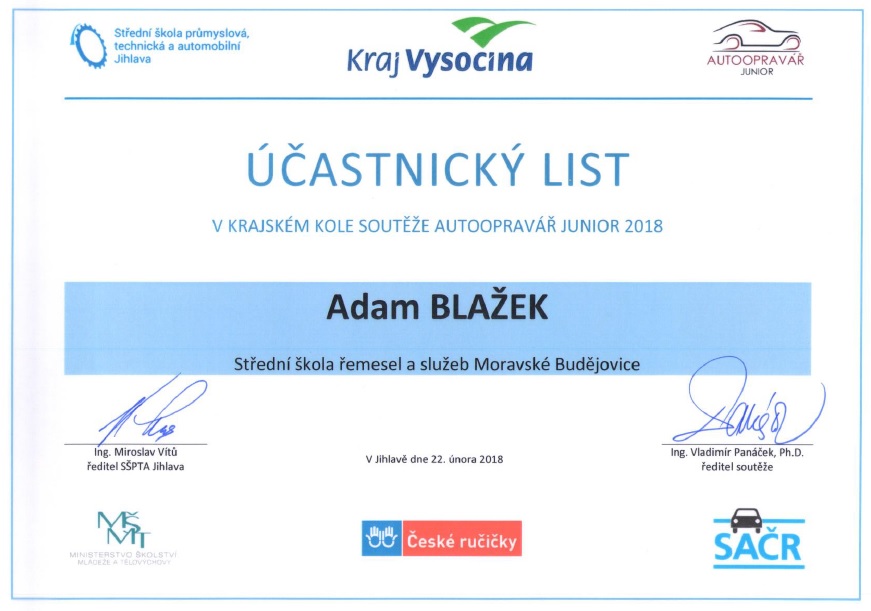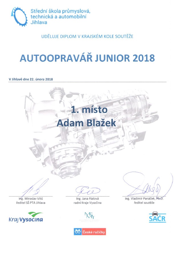 Dne 22. února 2018 se naše škola zúčastnila krajského kola soutěže AUTOOPRAVÁŘ JUNIOR 2018. Soutěž pořádala Střední škola průmyslová, technická a automobilní Jihlava, pod záštitou radní Kraje Vysočina Ing. Jany Fialové, MBA. Za naší školu soutěžil žák 3. ročníku oboru automechanik (mechanik opravář motorových vozidel) Adam Blažek a vybojoval úžasné 1. místo, s dostatečným předstihem před místem druhým. V současnosti se Adam Blažek připravuje na reprezentaci Kraje Vysočina v celostátním kole soutěže AUTOOPRAVÁŘ JUNIOR 2018 – AUTOMECHANIK, které proběhne 26. března 2018 v Service Training Center ŠKODA AUTO a.s., Kosmonosy, Mladá Boleslav a hlavním organizátorem je Integrovaná střední škola automobilní Brno, příspěvková organizace. Soutěž je v seznamu 10. ročníku přehlídky oborů ČESKÉ RUČIČKY.