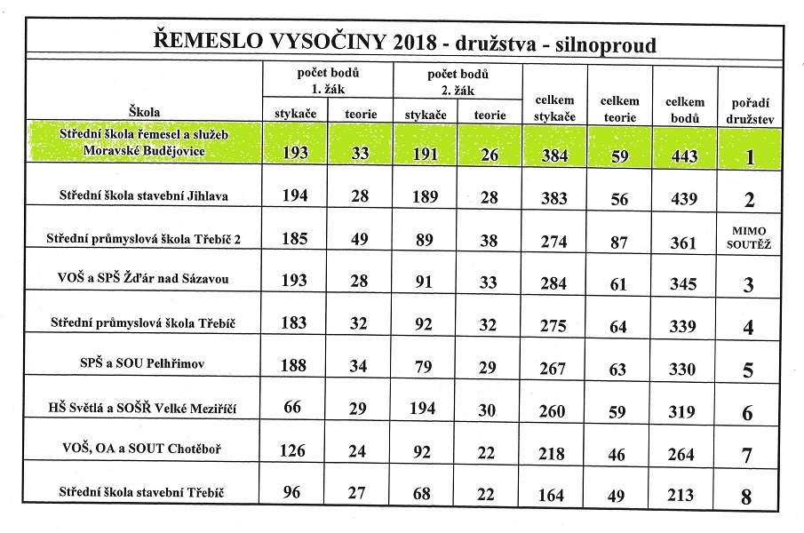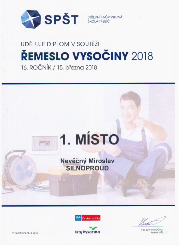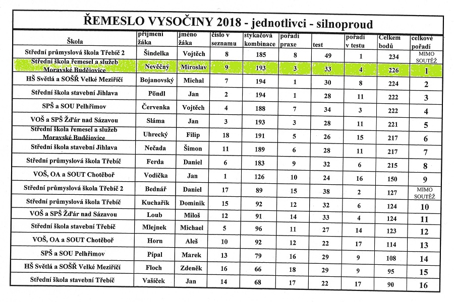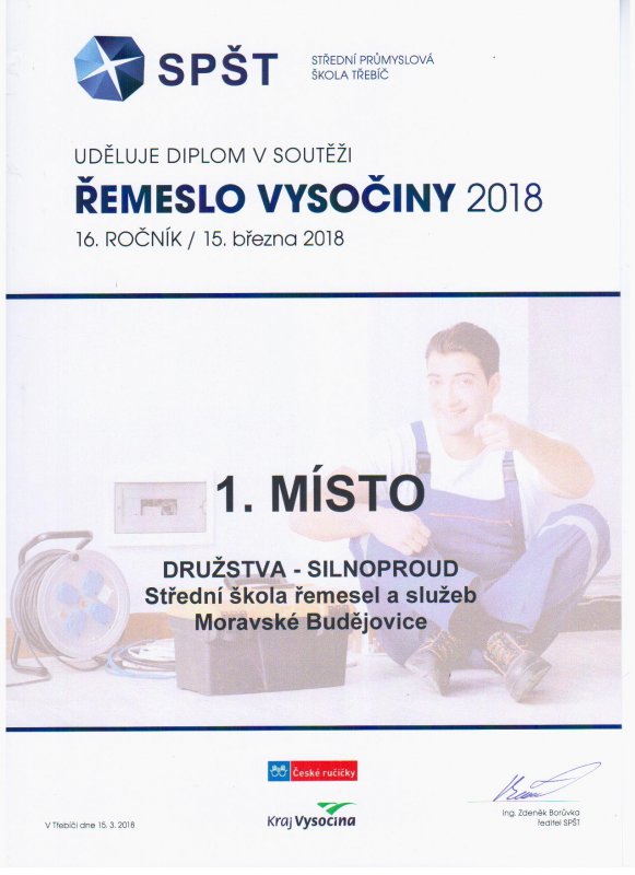 Dne 15. 3. 2018 se naše škola zúčastnila krajského kola soutěže odborných dovedností ŘEMESLO VYSOČINY 2018, pro obor Elektrikář – silnoproud. Soutěž se konala v areálu Střední průmyslové školy Třebíč. Za naši školu soutěžili dva žáci 3. ročníku oboru elektrikář, Filip Uhrecký a Miroslav Nevěčný. Soutěž byla koncipována pro jednotlivce i družstvo pro každou z devíti soutěžících škol kraje. Miroslav Nevěčný vybojoval 1. místo a Filip Uhrecký 6. místo v soutěži jednotlivců. V soutěži družstev součet bodů obou žáků vynesl také 1. místo. V současnosti se Miroslav Nevěčný připravuje na reprezentaci Kraje Vysočina ve finálovém kole soutěže odborných dovedností v rámci přehlídky ČESKÉ RUČIČKY 2018 elektro – silnoproud, která proběhne 18. 4. 2018 na Střední průmyslové škole Brno.