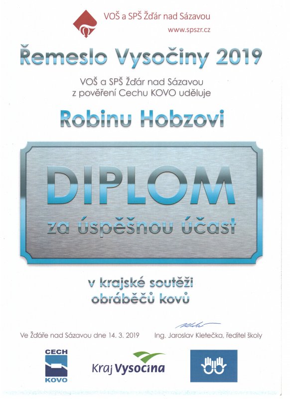 Ve dnech 13. – 14. března se uskutečnila soutěž ŘEMESLO VYSOČINY 2019, která byla vyhlášena z pověření Cechu KOVO jako krajské kolo pro žáky učebního oboru Obráběč kovů. Pořádající školou byla Vyšší odborná škola a Střední průmyslová škola Žďár nad Sázavou. Soutěž byla zaměřena na soustružení. Prvním úkolem bylo vytvořit danou součást na soustruhu ze zadané výkresové dokumentace. Dalším úkolem bylo prokázat základní teoretické znalosti z oboru v přesném měření součásti, zpracováním měřícího protokolu, rozboru uložení a výpočtu otáček ze zadaných hodnot.