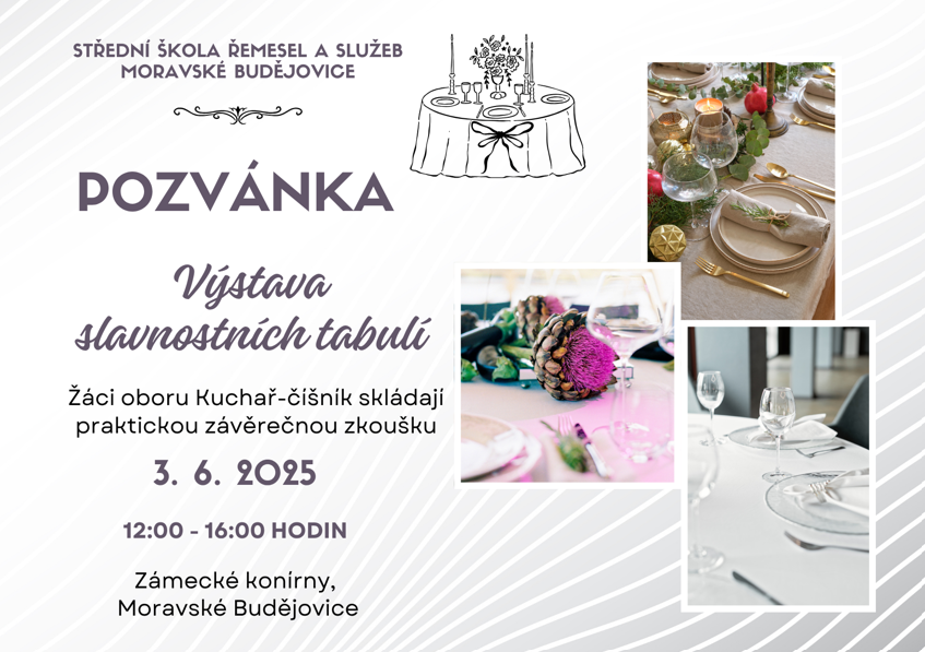 Srdečně Vás zveme na VÝSTAVU SLAVNOSTNÍCH TABULÍ našich žáků oboru kuchař-číšník, kteří skládají praktickou závěrečnou zkoušku